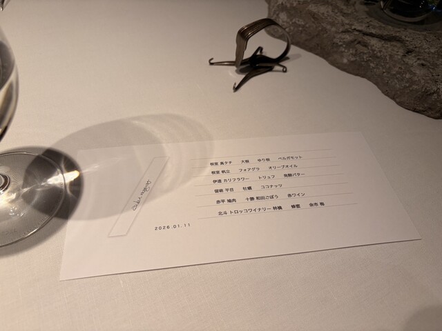 まずコースメニューを見た時に、かなり意図的に設計されたモダン•ガストロノミーを感じました。単なる高級食材の積み上げではなく、産地と香りの方向性が統一されたコースでした。北海道の食材を主役に、甘味・脂・酸・苦味・旨味を配置。そこに「香りのレイヤー」としてベルガモット、トリュフ、発酵バター、ココナッツ、赤ワイン、蜂蜜などを重ねる設計となり、その香りレイヤーが全体を一つにまとめる役割を担っていました。