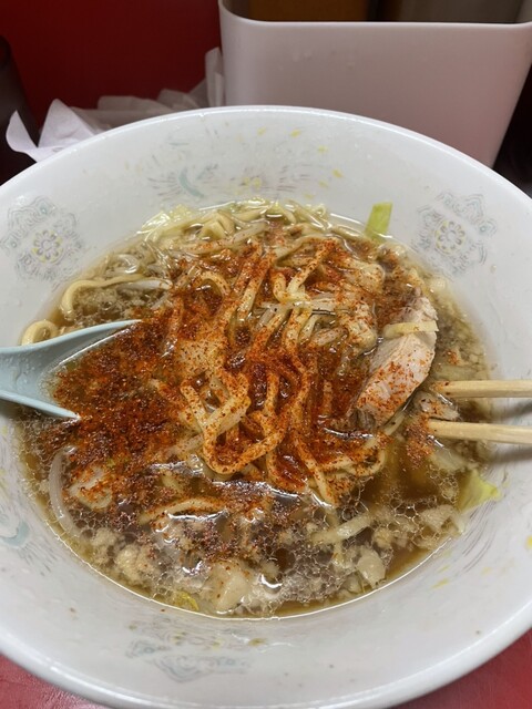 並んでる時間で『今日は筋トレしたし、腹ぺこだし、豚ラーメン(大)やさい少なめにしよう』と決めていた✋初挑戦ですᐕ)麺だけを楽しむ‼️ヤサイ少しの理由としては、野菜無しはラーメン二郎への背徳ではないかと…