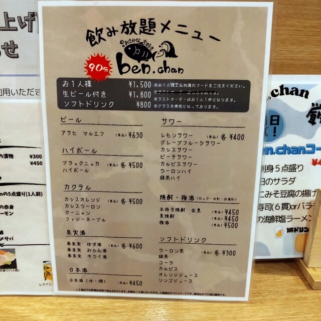 ビールはマルエフ、酒は作やキタノニシキこれからなど多数あり、仙禽無垢や三井の寿、雅山流別誂、日高見純米初しぼりなどの飲み比べセットもあり、魚に合うものや限定酒などの美味い酒を味わえる。
