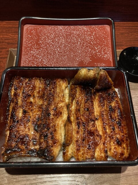 先に白焼きをいただきました。まずはそのまま食べてみると、鰻の脂が口内に広がりいつまでも後味が残ります。お皿に盛られた塩、山椒、わさびが混ざったものも絶品で、白焼に合います。2人であっさりと完食。