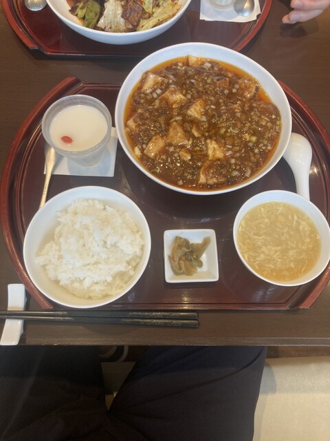 ランチメニューの中から陳麻婆ランチ(税込2,068円)を注文、辛さが選べるので控えめを指定。➕50円の杏仁豆腐も付けました。先に前菜3種が到着。よだれ鳥、チャーシュー、豚まんどれも美味しくメイン料理に期待が持てます。続いて麻婆豆腐、ライス、スープ、杏仁豆腐がワンプレートで到着。美しい料理ばかりです♪