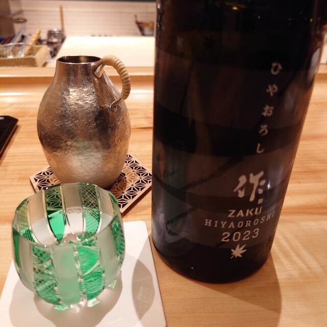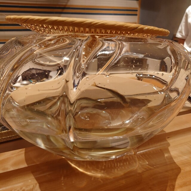 ここでお酒は日本酒に。大将お勧めのものを3杯程頂きました。女将さんがお猪口やグラスがのったお盆を持ってきてくれて好きなものを選べます。僕は大阪らしい「天満切子」のものを選びました。