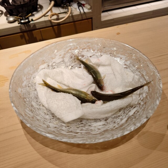 「子持ち鮎の唐揚げ」・・大将がまだ水槽で泳いでいる子持ち鮎を見せてくれて、その後仕上げてくれました。こちらも今が旬ですね。山椒入りの醤油ダレとカシューナッツで。さくっとした食感が最高。