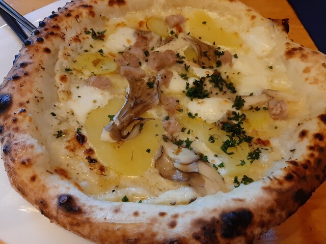クリームベースで、薄切りのじゃがいも、きのこ、