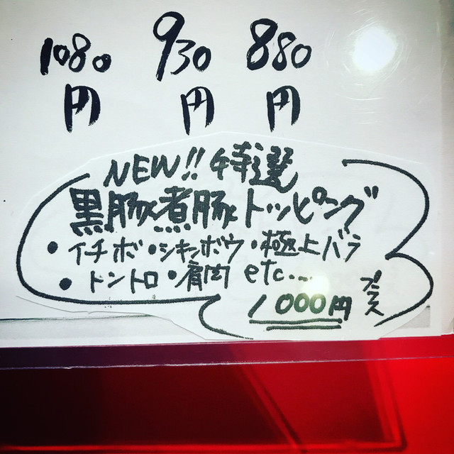 煮豚トッピングの部位の種類がイチボ、シキンボウ、極上バラ、トントロ、肩肉、etc…と増えていて、その日の1番オススメの部位を数種類出してくれるみたいです。