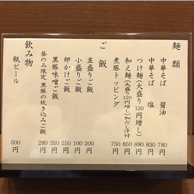 ラーメンのラインナップは、中華そば(醤油、塩)、つけ麺、和え麺の4種類になります。
