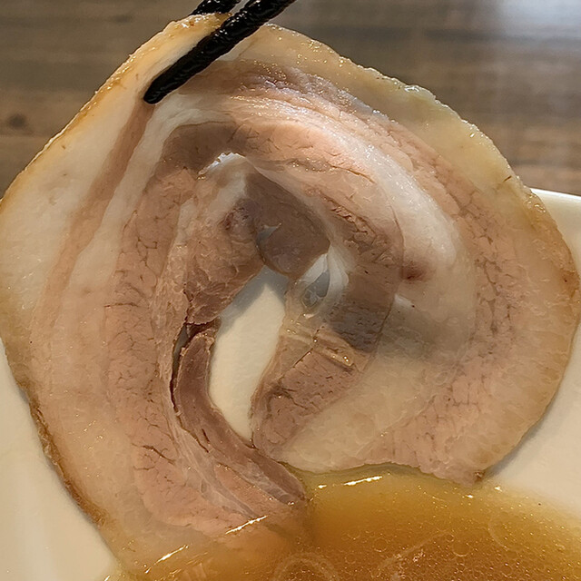 今回は、『白醤油通ちゃーしゅー麺』に吊るし焼豚のトッピングをして頂きました。