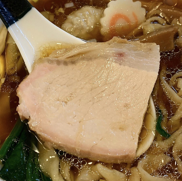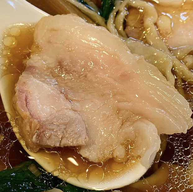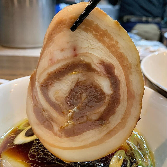豚チャーシューは、薄くて大判のものと、小ぶりで厚みのあるものの2種類で、しっとりと柔らかく、滲み出る豚の旨味と薫製の香りがたまらなく美味しいです。