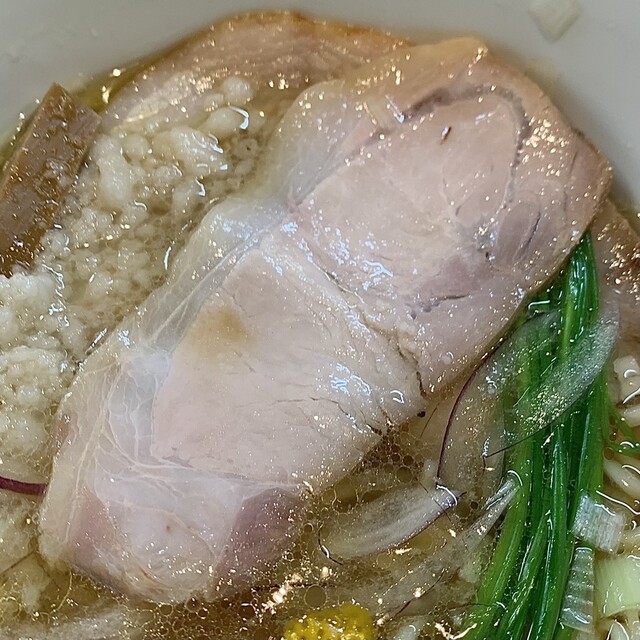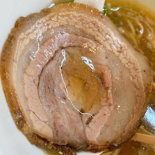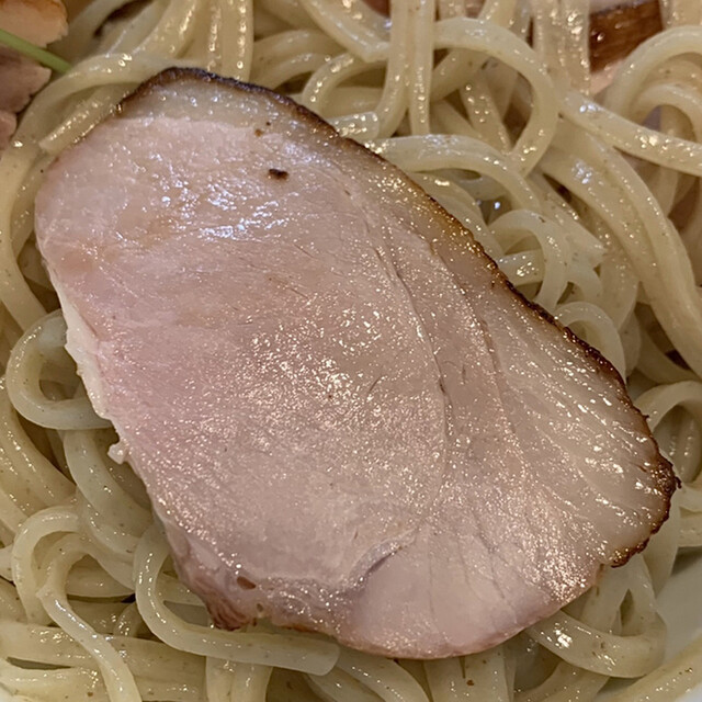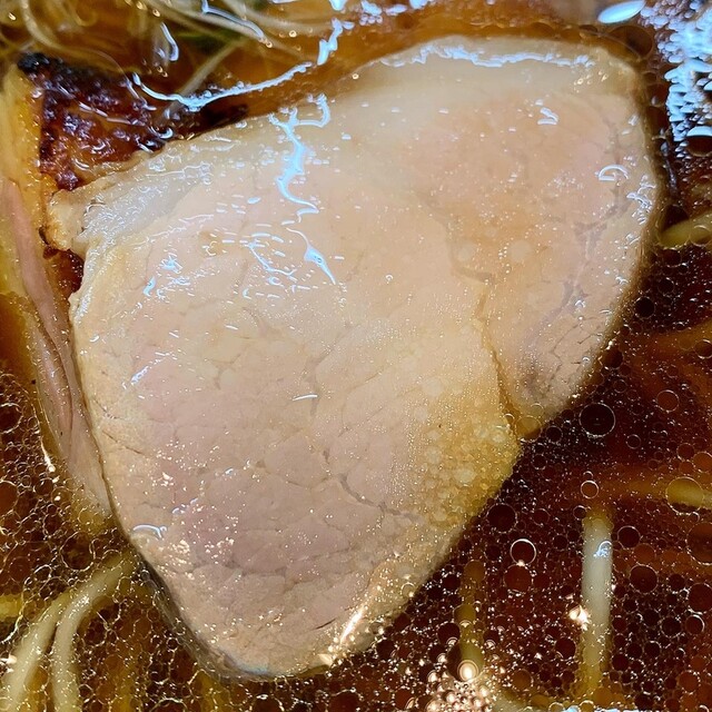 豚チャーシューは、炭火焼きの豚ロース肉で、しっとりと柔らかく、滲み出る豚の旨味がたまらなく美味しかったです。