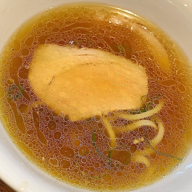 鶏の旨味が最大限に引き出された黄金色に輝くスープは、たっぷりと鶏油をかけた鶏ベースの醤油味でとても味わい深いです。