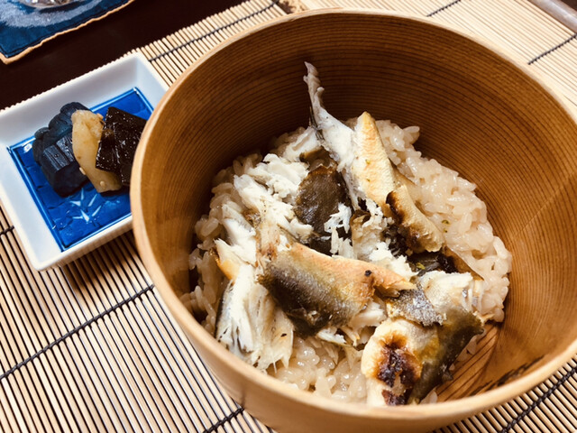 「鮎なのに海老反り」素揚げした鮎に、付け合わせの酢の効いたなれ寿司風味のご飯の相性完璧。