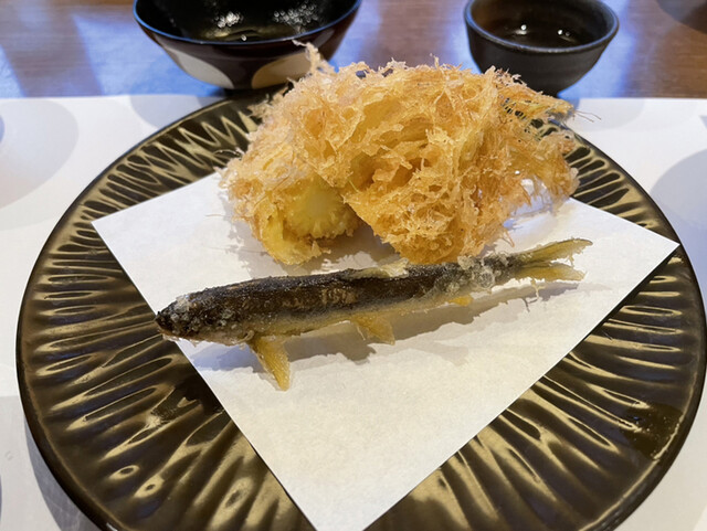 :稚鮎(上等)・ヤングコーン(ヒゲ絡むかき揚げ逸品)。