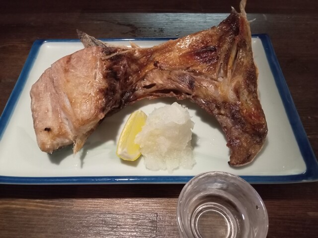 刺身3種(シマアジ、本マグロ中トロ、カツオ)をハーフで注文、さらに大ワラサカマ焼きを。