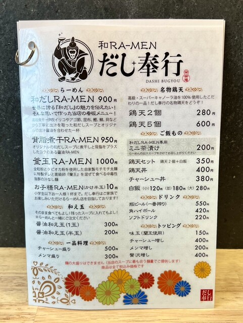 12時半に店に到着!駐車場はまあまあ広く2台ほど空きがあるくらいの満車状態でした〜店に入って名前を記入し〜タッチパネル券売機にて〜「お得平日ランチメニュー」の表示が目に入りソチラから〜「背脂煮干RA-MEN + 本日のミニ丼 + 鶏天2コ」¥1,400 を買って、店の方に席に通されカウンターに着席。満席状態でしたが席数も多いからか待ちなく行けました♪カウンターから厨房を見渡すとオープンしてまもないからか…スタッフが多くイロイロと説明しながら営業されてました。