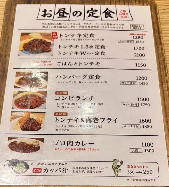 店の前に着いたのは13時半頃…並びはないけど外で待つ…この待ってる時に注文を取られる…メニューを見て「トンテキ1.5枚定食」¥1,700をオーダー!友達は「ハンバーグ定食」¥1,200にしてました。汁物も欲しかったが売り切れで断念しました。