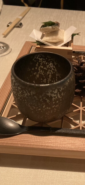 先ず①「料理」畏敬の念を込めたかのように季節の食材を取り入れられた料理、またフレンチと言えばソースと火入れ技術、装飾・・・、どれを取っても誠に素晴らしい。組子細工と和食器を多用するシェフの巧みさにも脱帽である!セ・デリシュとお礼の言葉だけなく、トレビアーンと山田料理長には驚きを持って伝えざるを得ないのであろう!