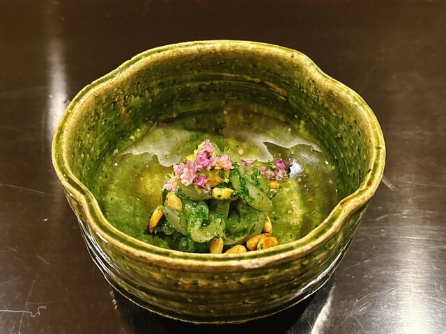 マハタの春菊和え、松の実
