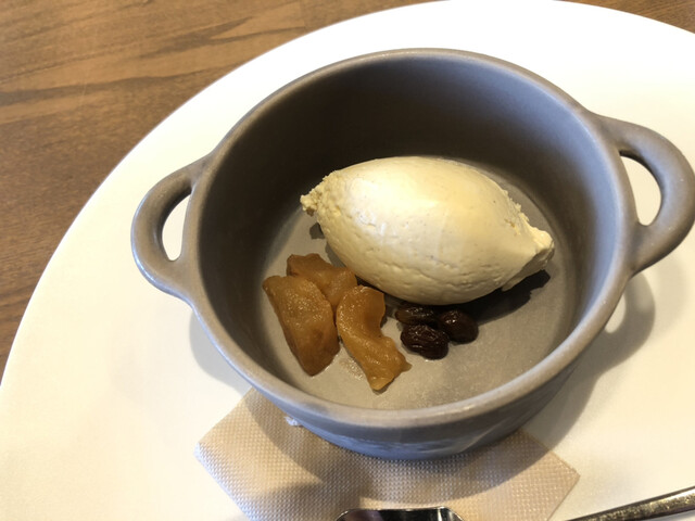 自家製アイス。林檎のキャラメルゼとラムレーズン。ラムレーズンはお酒強めに漬けているらしく、かなり美味しいです。アイスもハーゲンダッツ顔負けです。