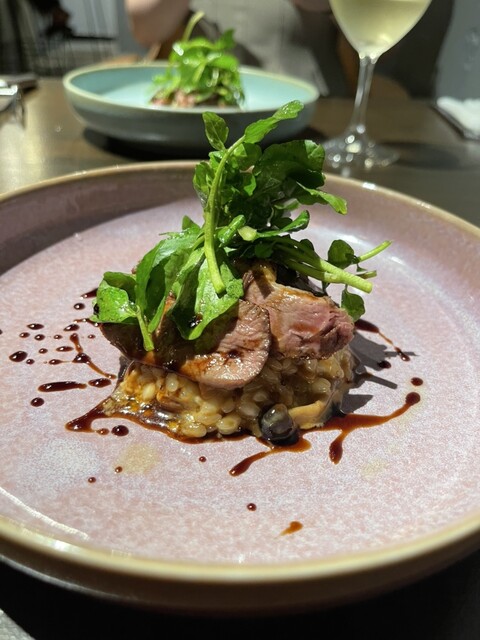 鴨のリゾットは、キノコのリゾットの上にカモ胸肉のソテーが乗っていて、バルサミコのソースがかかった一品。