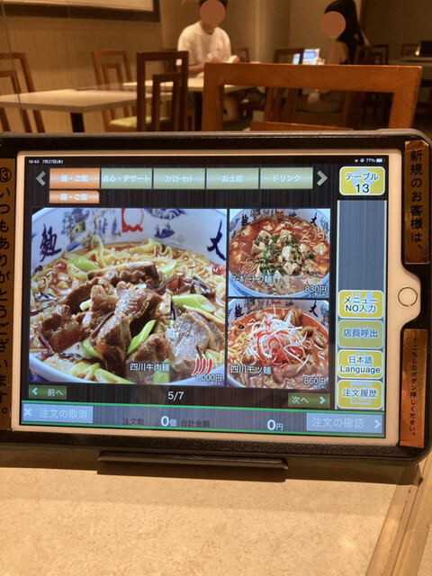 前回訪問時までは、ランチタイムは、入口脇にある「券売機」で予めチケットを購入するスタイルで、ディナータイムはメニュー表を眺め注文するスタイルでしたが、タッチパネルでメニューオーダーシステムを導入されていました。