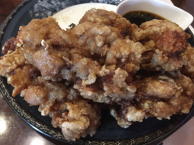 油淋鶏のような甘酸っぱいソースにつけてパクリ。