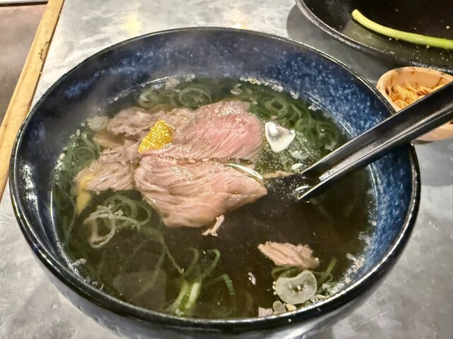 長いネギを巻いて食べるタン。