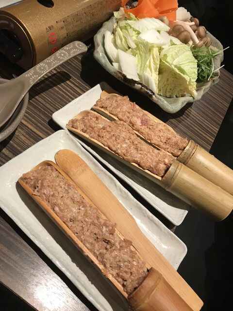 たくさん食べたいからと、2人ですが3人分で作ってもらいました。お店に着くとすぐ、セットが用意されました。鴨つくねをまずいただき、野菜も入れて調理。野菜が入るととくに、一般的なナゴヤの味付けからすると少し薄めでしょうか。テーブルの蕎野ソルトのほかに、ポン酢、柚子胡椒、大根おろし、ねぎが用意されていたので、私たちは柚子胡椒を好んでいただきました。