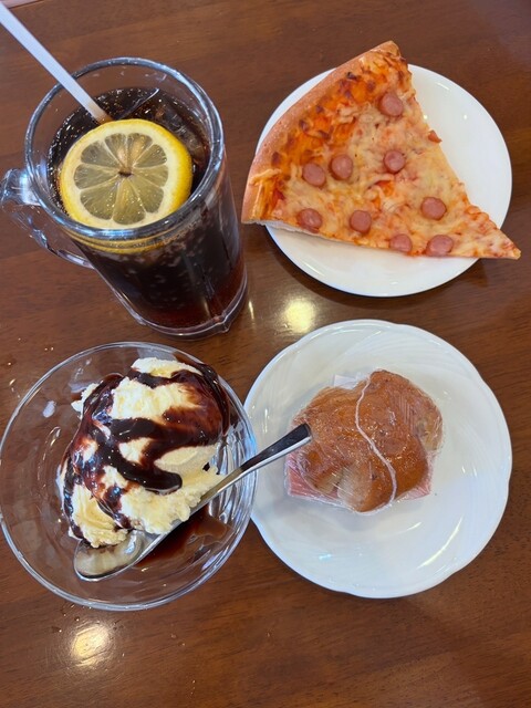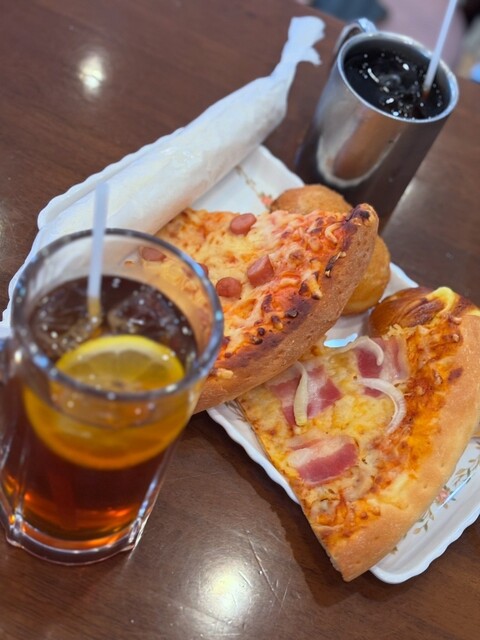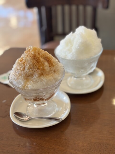 かき氷紅茶、アイスコーヒー加糖、パン2個サービス