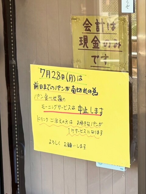 2025/07/28の営業を最後に閉店。ドリンク代だけで食べ放題のモーニング、種類豊富なお値打ちなパン。ありがとうございました。
