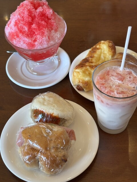 かき氷いちご、氷カフェいちご、パン2個サービス