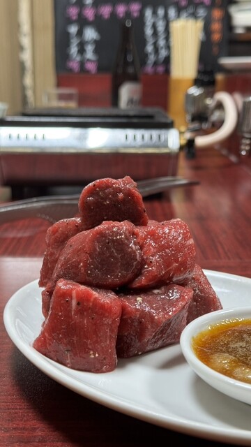 古き良きの情緒ある商店街に構える赤カウンターの焼肉屋。
