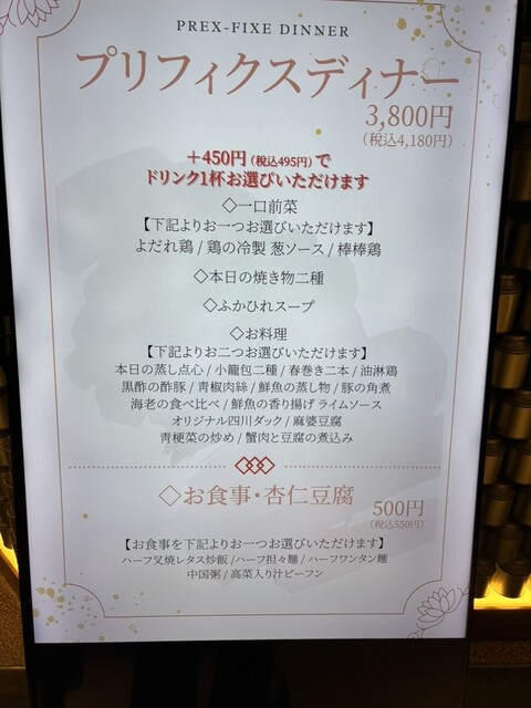 火曜日の午後6時30分にお店に入りました。私たち以外に4組のお客さんが来ていました。平日の夜ということもあり、店は比較的空いていました。以前、オーブン直後の昼に来ましたが、その時はなかなかは入れませんでしたが本日はすんなりでした。プリフィクスディナーを頼みました。午後7時までに入ると飲み物が450円になりますし、プリフィクスディナーを頼んでも1杯だけですが飲み物が450円となりました。そこで、紹興酒を2杯合計900円で頼みました。2杯も頼むと飲むのに大変かなと思いましたが、お酒が出てくると1杯50mg程度で全く問題ありませんでした。前菜の鳥料理は3種類から1つを選択します。私は鳥の冷製葱ソースを頼みました。鳥は柔らかく、葱ソースもちょうどいい酸味であり絶品でした。タレを飲み干したくなりました。次は焼き物として、サラミとチーシューのようなものが出てきました。これがまた感動するほど美味しいです。その次はフカヒレのスープでした。間違いなく、美味しいです。その後メインですが、14種類の中から2つを選べます。私は、海老の食べ比べと黒酢豚を頼みました。海老はマヨネーズ掛けと卵黄がかかったものが出てきました。これも絶妙です。酢豚もとにかく美味しいです。そこでコースとしてはお終いですが、500円程度追加すると食事を選べます。私はチャーハンを頼みましたが香ばしくて美味しかったです。その後、たぶん、食事を頼んだからデザートとして杏仁プリンがついてきました。とにかく大満足でした。夜であることを考えると、それほど、金額的には高くもないのですが、満足度は非常に高かったです。値段を考えると絶対におすすめです。