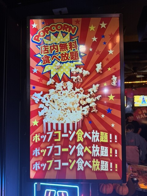 店内の雰囲気もカジュアルで、若者からサラリーマンまで幅広い客層が訪れています。特にポップコーンの食べ放題サービスが目を引きました。無料でポップコーンが食べ放題というのは珍しく、気軽につまめるので、ドリンクを片手におしゃべりを楽しむお客さんも多かったです。こうした気軽さが、この店の大きな魅力のひとつです。