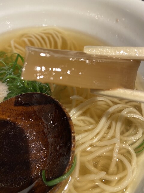 透明に少し黄金色がかかったような澄んだスープに綺麗な麺線、ピンクのレアチャーシューと青ねぎの緑が美しい。