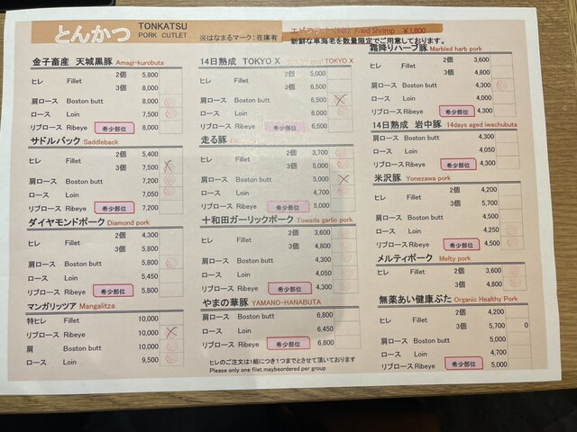 メニューのとんかつはかなり売り切れ、紅の印が