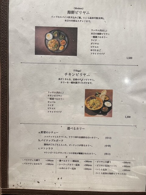 メニューを見るとあまり聞いたことのない、海鮮ビリヤニがあります。かなりのビリヤニ好きの私ですが、海鮮のビリヤニは初めて、お店の”伝統 x 革新”にも合ってそうなので、頼んでみました。