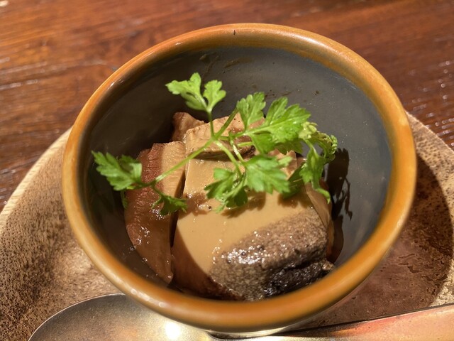 柔らかく煮た豚バラ肉を野菜とともにパンチの効いたソースをつけていただきます。このソースがゴーヤと青唐辛子、シェーブルチーズ。それをバーボンの樽で熟成させたという日本酒が力強く受け止めてくれました。
