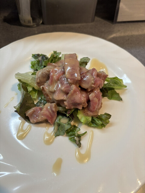 牛のタタキは、牛ヒレを目の前で焼かれ、細かくカットされ、レタスにドレッシング。ビールがすすむ。