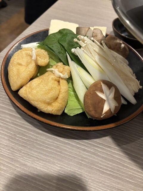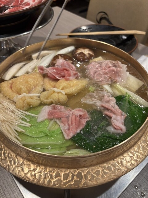 その後、野菜とロース肉。つけだれは、なんと鍋スープに卵を溶き、すき焼き風に食べます。