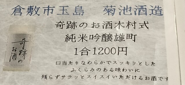 いや~このお店美味いし、雰囲気も良く最高です。倉敷で当たりました。お腹一杯食べて飲んで、2人で12,000円くらい。大満足です。