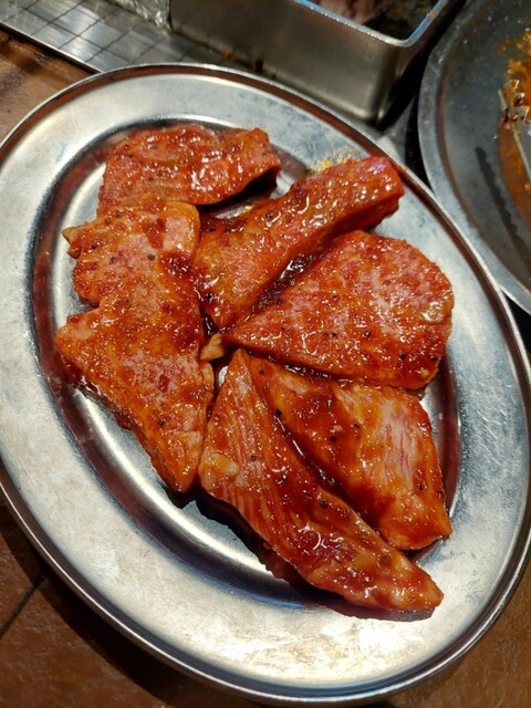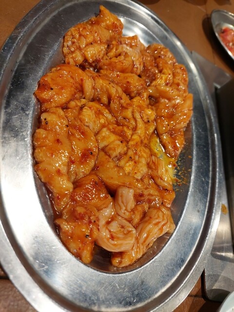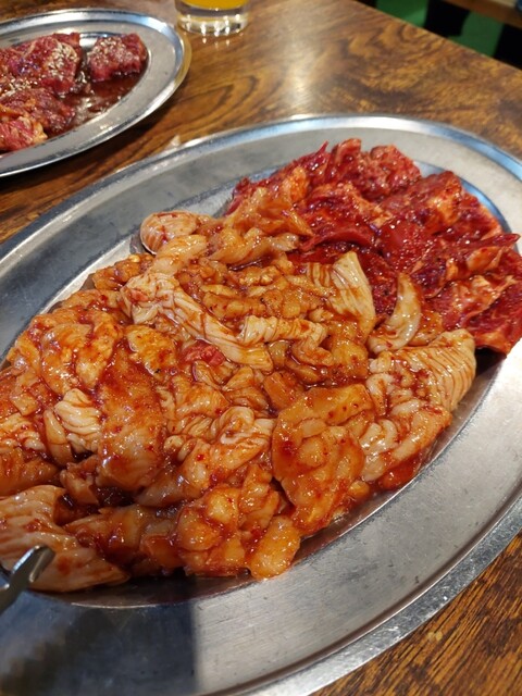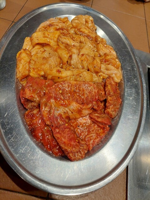 肉多め大皿9200円3つ、ハラミ1750円6人前、上ミノ900円6人前、テッチャン880円6人前を追加して更に肉多め大皿9200円1つオーダー(*゜Q゜*)