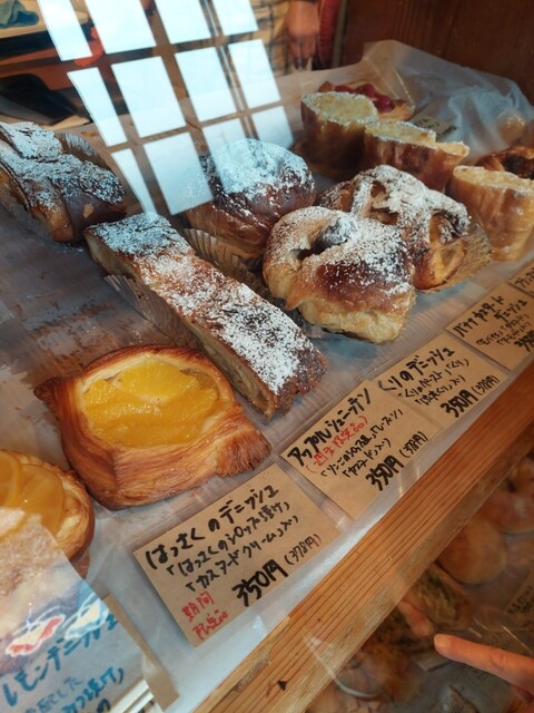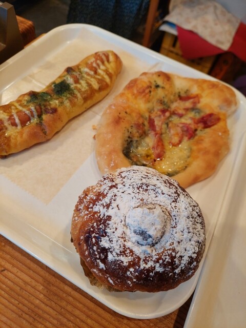 栗のデニッシュ、バジルとトマトのパン、ソーセージのパン、ゴボウとベーコンのパン、フランスパンを購入。