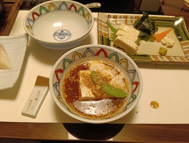 豆腐づくしの料理で先ずは湯豆腐。とろっとろあつあつの湯豆腐は文句のつけようがありません。生姜と胡麻をまぶせば、それだけで一段とレベルアップ。生麩田楽は、モチモチ。次は意表を突いてふぐの唐揚げ。骨に気をつけながらしっかり味わえた。湯葉の刺身は、思わずウマっ!山葵を添えて食すと、これは最高でした。そして鰤と湯葉のしゃぶしゃぶ、これは何と言っても出汁がめちゃくちゃウマい!!思わず飲み干してしまった。そして、ウナギのセイロ。山椒の風味が広がりいい仕事していました。最後は豆乳アイス金柑ソース添え。さっぱりアイスに金柑ソースが濃厚に絡んで大変美味しかった。庭の景観も室内の清潔さも相まって大変贅沢なひと時でした。