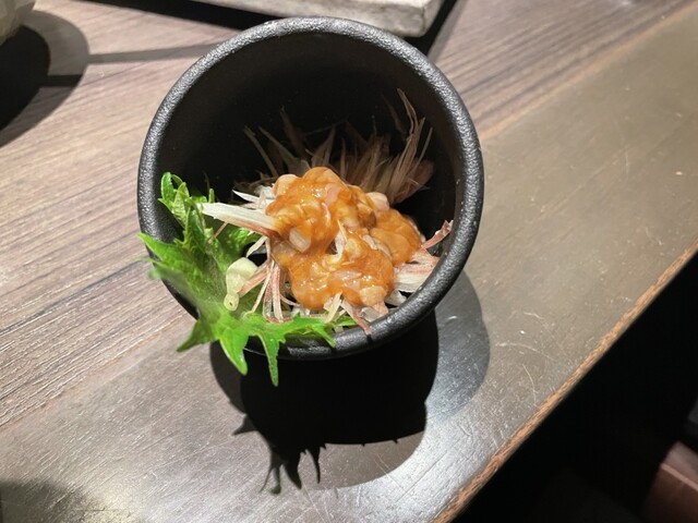 酒盗のミョウガ和え600円くらい。酒盗は自家製と思われる。塩辛過ぎない酒盗とシャキシャキした食感のミョウガと混ぜて食べると絶品でした。