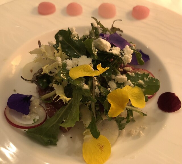 [2]鹿肉の温製カルパッチョ、蕩けるチーズとりんご