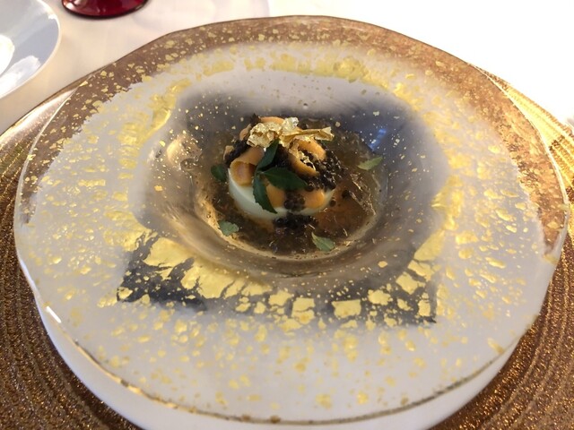 [1]焼白子ムースとアン肝スモーク、春菊グリーン、トリフキャビア 生うに追加 +¥1,500
