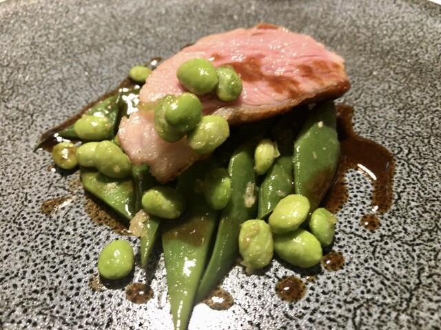 写真に撮り忘れましたが、前菜にしめ鯖ヨーグルトアイスソースがけ、ガスパチョ、インゲンのフラン添えも。LE CIELさん、和の食材をフレンチに融合して、日本人に親しみ易くかつフレンチの優雅さを兼ね備えています。私の中で勝手にジャポネフレンチと命名。今回特に感銘を受けたのは、岐阜の知り合いのハンターに送ってもらったという猪を使ったペシャメルソースラビオリ仕立てモレソースがけ。モレソースが何だか忘れてしまいましたが、ポルトソースのような風味がありました。私の好きな要素が詰まった絶品。ワインペアリングで合わせるのはシャブリプルミエクリュ。やばすぎです。いくらでも食べたいです。鮎は米粉のクレープに揚げた葉生姜とタルタルソースがかかっていて、自家製チリソースも合わせていただきます。まさにジャポネフレンチ。スズキは鮑と肝のリゾットに赤ワインソースを合わせて。魚に赤ワインは初めてで、合わせるワインもピノノワール。初体験でしたが、滋味深い組み合わせを楽しみました。素晴らしい。メインはマグレ鴨。香ばしい皮目と臭みの全くない滋味深い赤身、これも大変素晴らしいお皿でした。