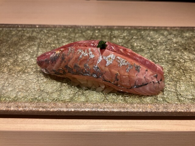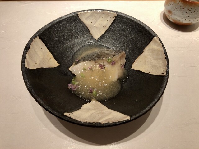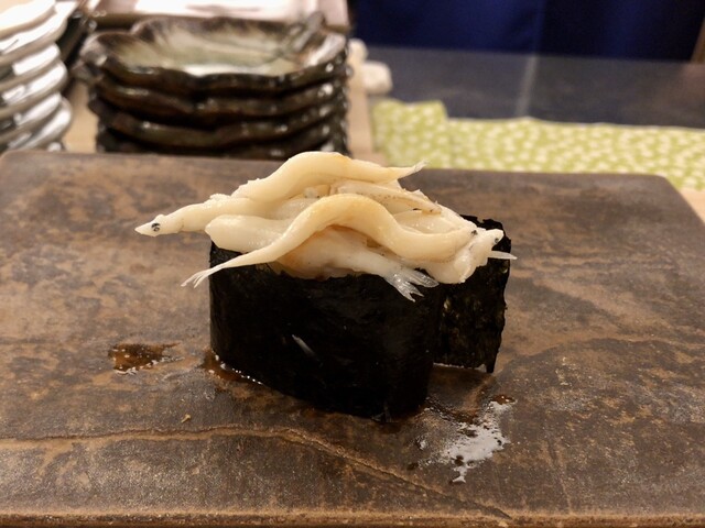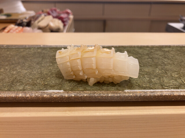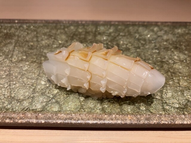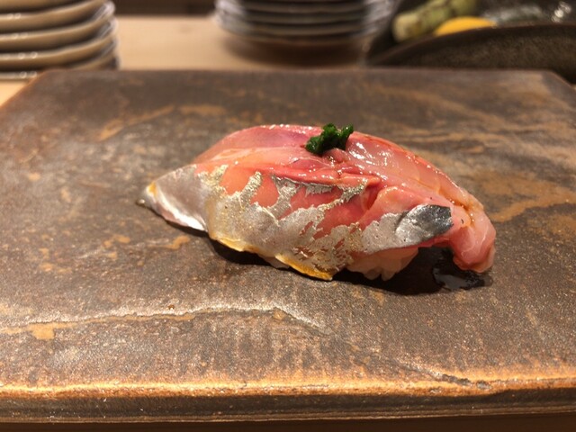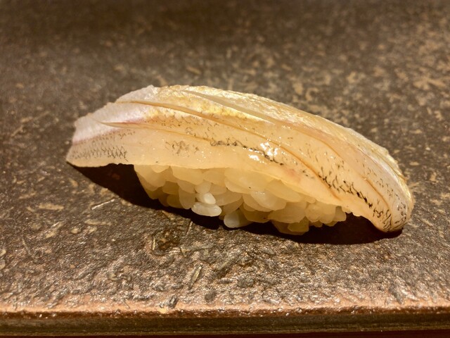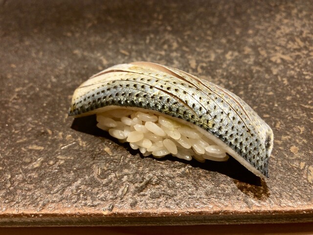 国立市にお住まいになられていた作家の山口瞳さんのエッセイにある「○○○の新子を食べないと私の夏が終わらない」に影響されて、コハダが大好きな私の中では新子はとても特別な位置づけの鮨だねですが、あまり出会ったことがないです。昨年ひろ海さんのインスタに「新子始めます!!」の投稿があったのですがタイミングが合わなくて、1年越しになりました。今回で10回目のひろ海さん、毎回楽しみにしているおつまみも益々洗練されています。お勧めのお酒をちびちびやりながらお鮨までの序曲を楽しみます。もちろん無濾過純米生原酒。そして、本日のメインの新子がやってきました。3枚重ねて握られています。・・・。美味し過ぎて言葉が出ません。続くお鮨、石垣貝も大変珍しいネタとの事で素晴らしかったですが、こちらも含めて他のにぎりもそれぞれの良さを存分に味わう事ができました。益々素晴らしくなっていると思います。それにしても新子、また来年食べる事を生き甲斐にする、と言ってもよい位。山口瞳さんがご存命だったら、きっと通うと思うお店、と妄想しています。また次が楽しみです。