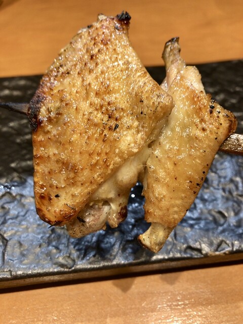 JR上野駅入谷口から徒歩2分位、上野アーバンホテルのお隣にあります。ホテルの青い看板が目印になります。和モダンな外観、木を基調とした落ち着いた店内にはジャズが流れています。予約で希望したカウンター席に着席。他に掘りごたつ式の席があります。カウンターには、ガラスで仕切られた焼き場があります。換気がよくされていて、煙が部屋に流れる事はありません。・・・お任せ焼き鳥5本にポテトサラダとトマト三杯酢をオーダーしました。付出しは大きななめこが入ったみぞれ餡。次に出てくる串焼きに期待が膨らみます。まずは合鴨串をいただきます。厚みのある合鴨、芯まで火がしっかり入っていますが、柔らかく独特のくせもなく大変な美味しさ。2種類のジャガイモを使ったポテサラと三杯酢の染み込んだトマトは串の間に交互に出してくれるなど気遣いが嬉しい。珍しい田酒の焼酎があったのでオーダー。清酒かすで作った米焼酎、吟醸酒のような香りがします。その他の串は写真の通りですが、薪を使った薫香をまとって、香ばしく、柔らかく、そして熱々の素晴らしい炭火焼きの串を堪能しました。〆のラーメン、スープと麺のシンプルですが、鳥の旨味が濃縮されたスープは素晴らしく、必食です。まだ若い店主さん、素晴らしい焼きの技術と丁寧な仕事です。焼きに集中する姿はかっこいいです。また来たいと思います。