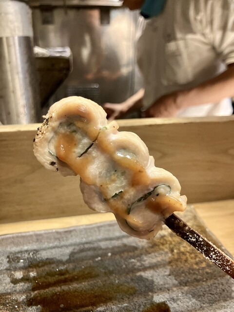中野駅からサンモールを歩いて突き当りを右折白線通りを少し歩いて左手の路地に入った所にあります。「鳥聖」の露地行灯が目印です。入口の引き戸をくぐってすぐのカウンターに着席です。人が座ると、後ろの壁にもたれる事ができます。2階にも部屋があるようですが、こじんまりとしたお店です。お好み三種盛りと、おまかせ5本をオーダー。三種盛りはいくつかのメニューから選ぶ方式で迷ってしまいます。黙々と仕事をされている大将が料理をカンター越しに渡してくれます。三種盛りは箸休めにとてもよいです。串は写真の通り、つくね、ねぎま、レバー、砂肝、ささみシソ巻の順で出てきました。炭火で焼かれた串は火の通りが素晴らしく、熱々ジューシーで鳥の濃い味が楽しめます。ビールの後は、日本酒の鍋島と花邑をいただきます。シャンパングラスは飲みやすくて、飲みすぎ注意です。〆にオムライスか親子丼か迷っていると、大将からオムライスを薦めてもらいオーダー。ほどなく、ケチャップライスに綺麗に焼かれたオムレツが載ったお皿がナイフと共にやってきました。ナイフでオムレツに切り込みを入れるとトロトロの玉子が広がります。映画「たんぽぽ」で出てきたあのオムライスです。玉ネギと鶏肉の味の濃いチキンライスとこれも濃厚なオムレツが一体となって、パクパク食べられます。大変美味。大将から修行先の話を聞かせていただいたり、居心地のいいお店でした。また来たいと思います。ご馳走様でした。